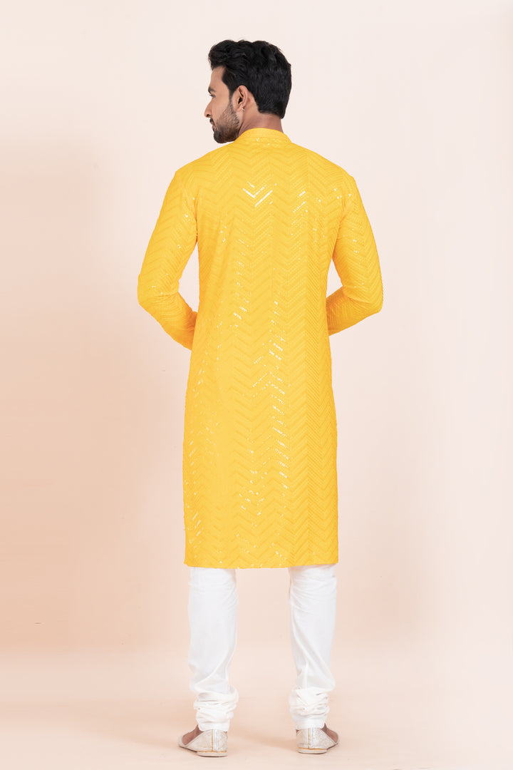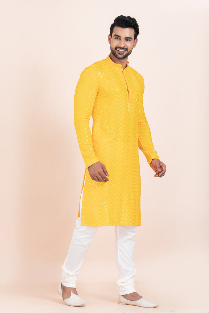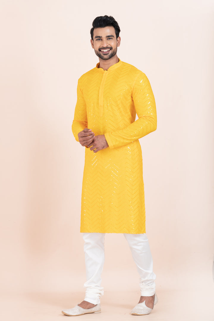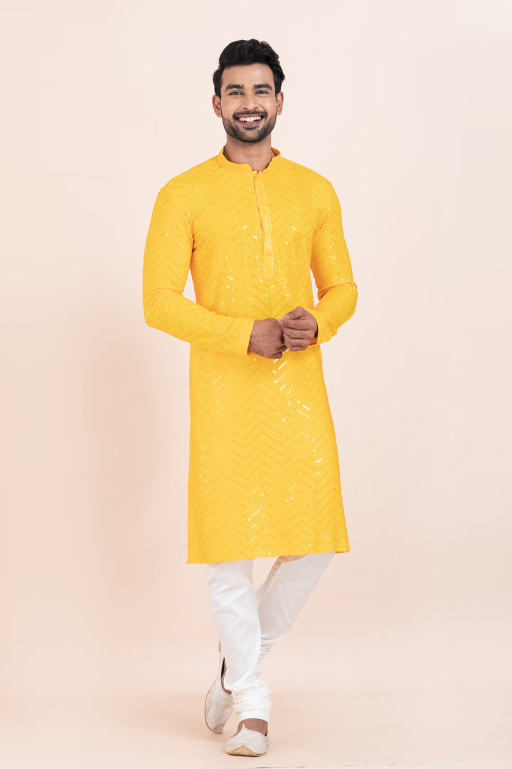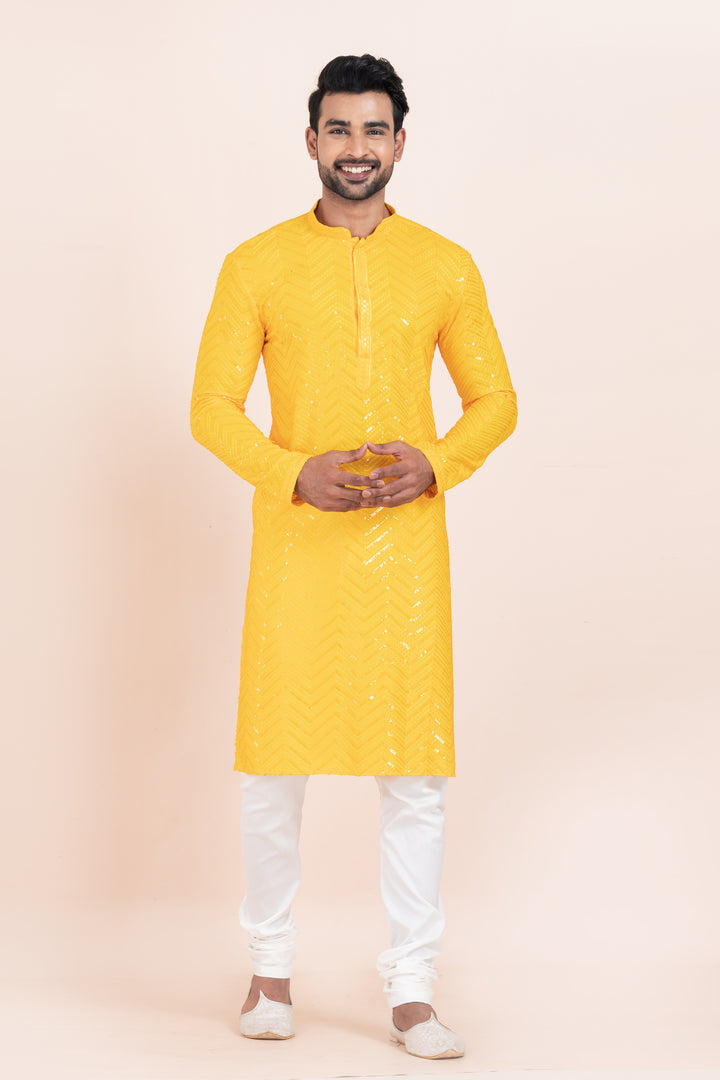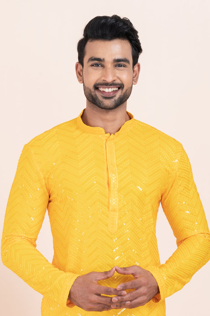 Step into the spotlight with this Yellow Sequin Kurta Set, designed for the modern man who loves to stand out!